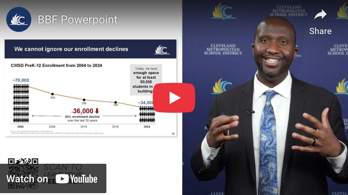 Last winter, we launched Building Brighter Futures (BBF), a strategic initiative to tackle several challenges at once: declining population, rising costs, and under-enrolled buildings are making it difficult to offer the same programs and opportunities for all students. CMSD has made real progress, and many of our scholars are thriving, but for far too many, their schools can’t and don’t offer the programs and opportunities scholars deserve.