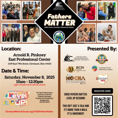 Formerly known as the Fatherhood Table Talks, the CMSD Fathers Matter: Level Up Sessions are back and bolder. These curated gatherings are for fathers, male role models, educators, and community partners who are ready to show up, speak up, and level up—for our children, our schools, and our communities.